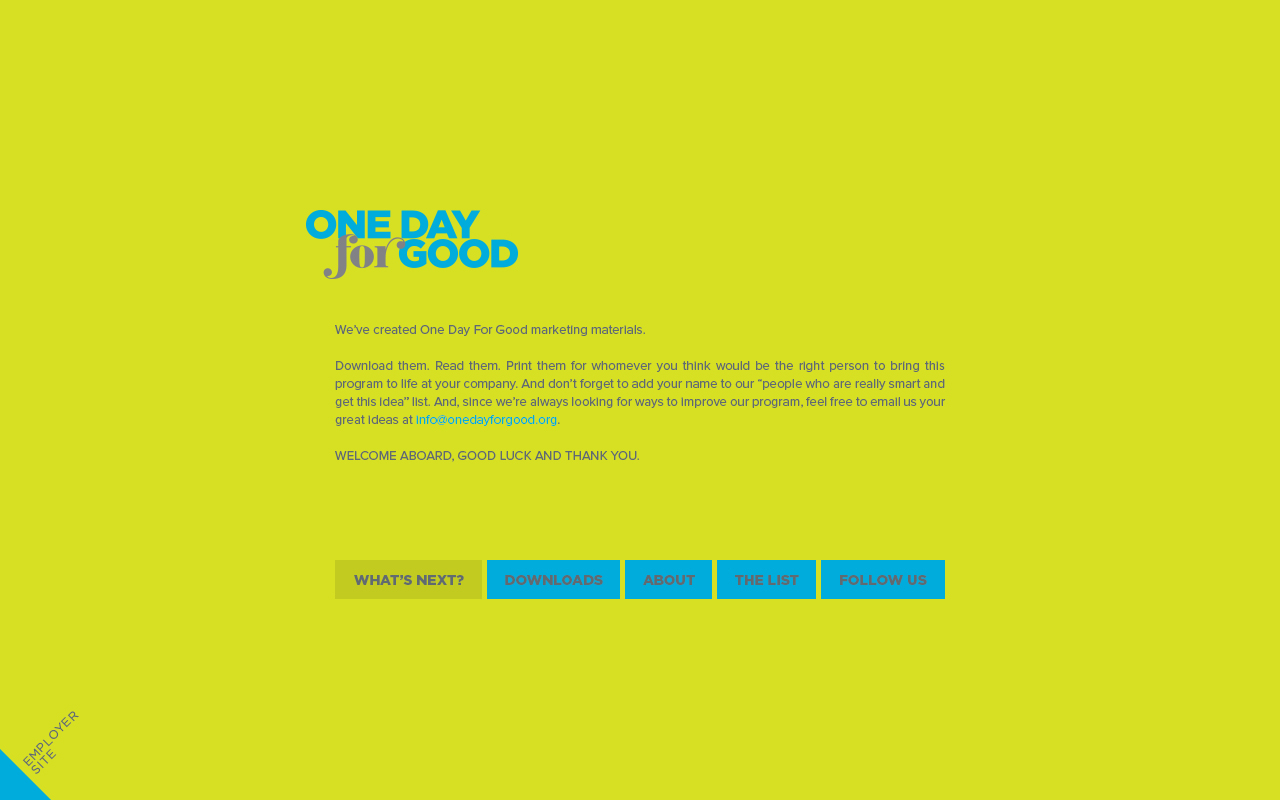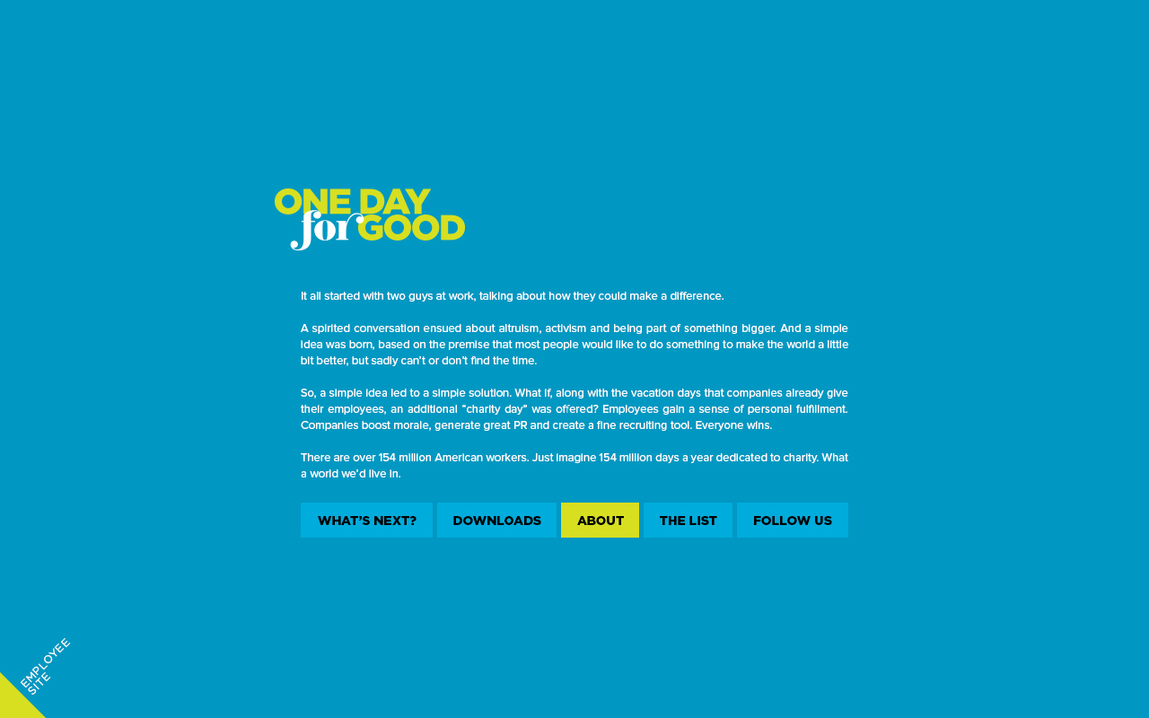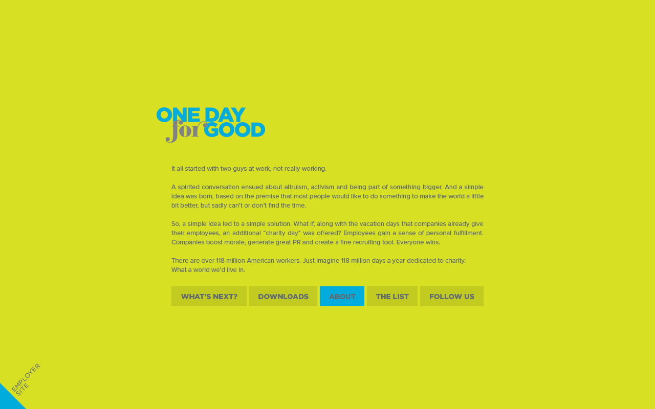 One Day for Good is an idea. It came into being when my writer, Nick Liebeskind, and I were lamenting the fact that, while advertising is a pretty great job in general, most of the time what we do isn’t truly meaningful. So we looked into volunteering for a charitable organization, but what we found was that they really need volunteers during the workweek, not the weekend as we were planning. Now came the tough question, were we willing to give up a precious vacation day to do good in the world? Or was there another way?